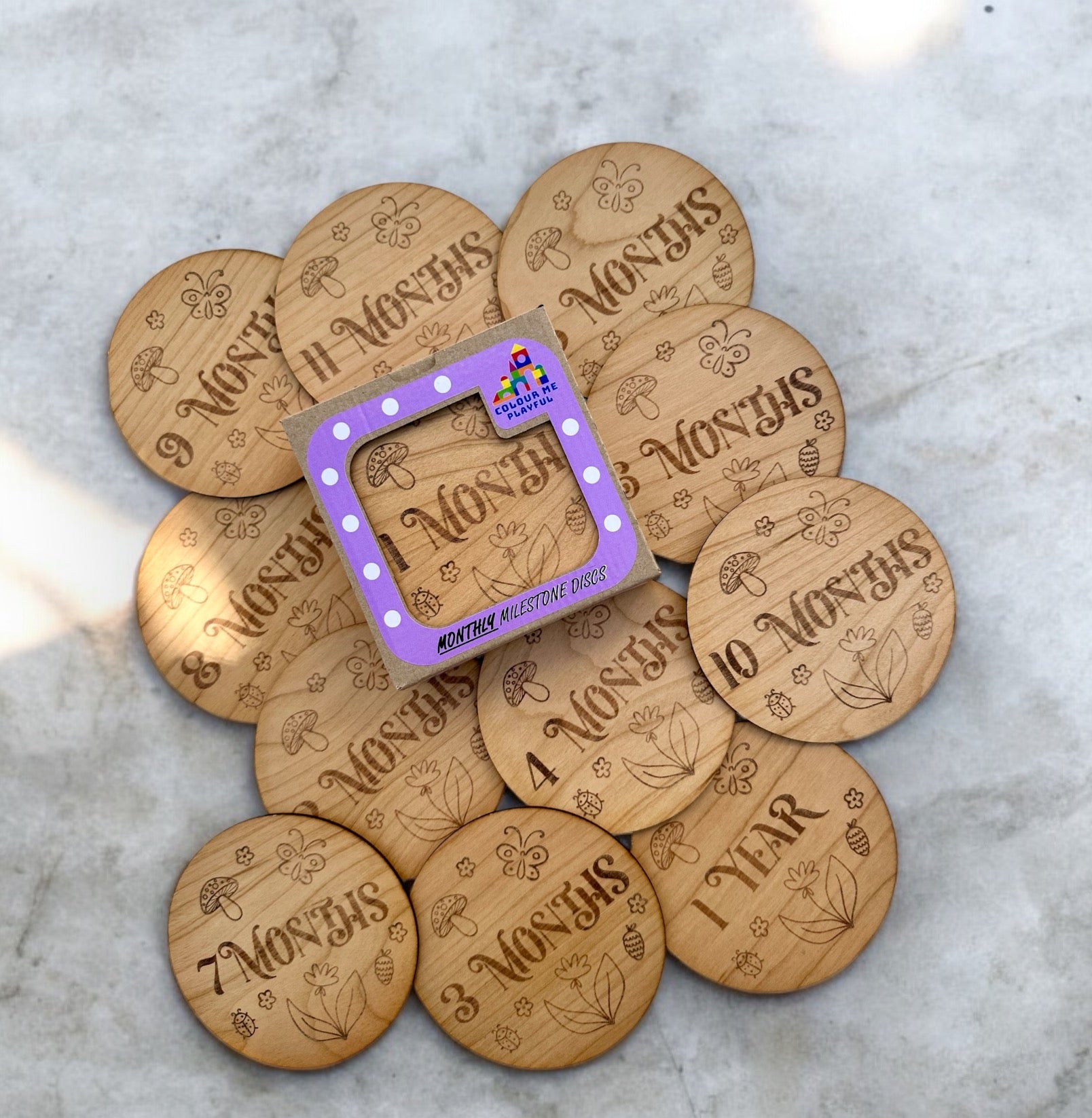 Capture every precious moment with our Nature-Themed Baby Milestone Tiles — A set of 12 adorable milestone tiles designed to celebrate your little one’s growth in the most enchanting way. Each wooden tile is lovingly crafted with delicate nature-inspired designs, from charming woodland creatures to fluttering leaves, making them the perfect prop for documenting your baby’s milestones. These milestone discs add a touch of natural magic to every photo. Because your baby’s journey is a story worth sharing, and we’re here to help you tell it — one milestone at a time. Create everlasting memories using these tiles as props in your baby’s photoshoots. You will treasure these Memories forever! Perfect for nature-loving mamas who want to treasure every step of their baby’s adventure!