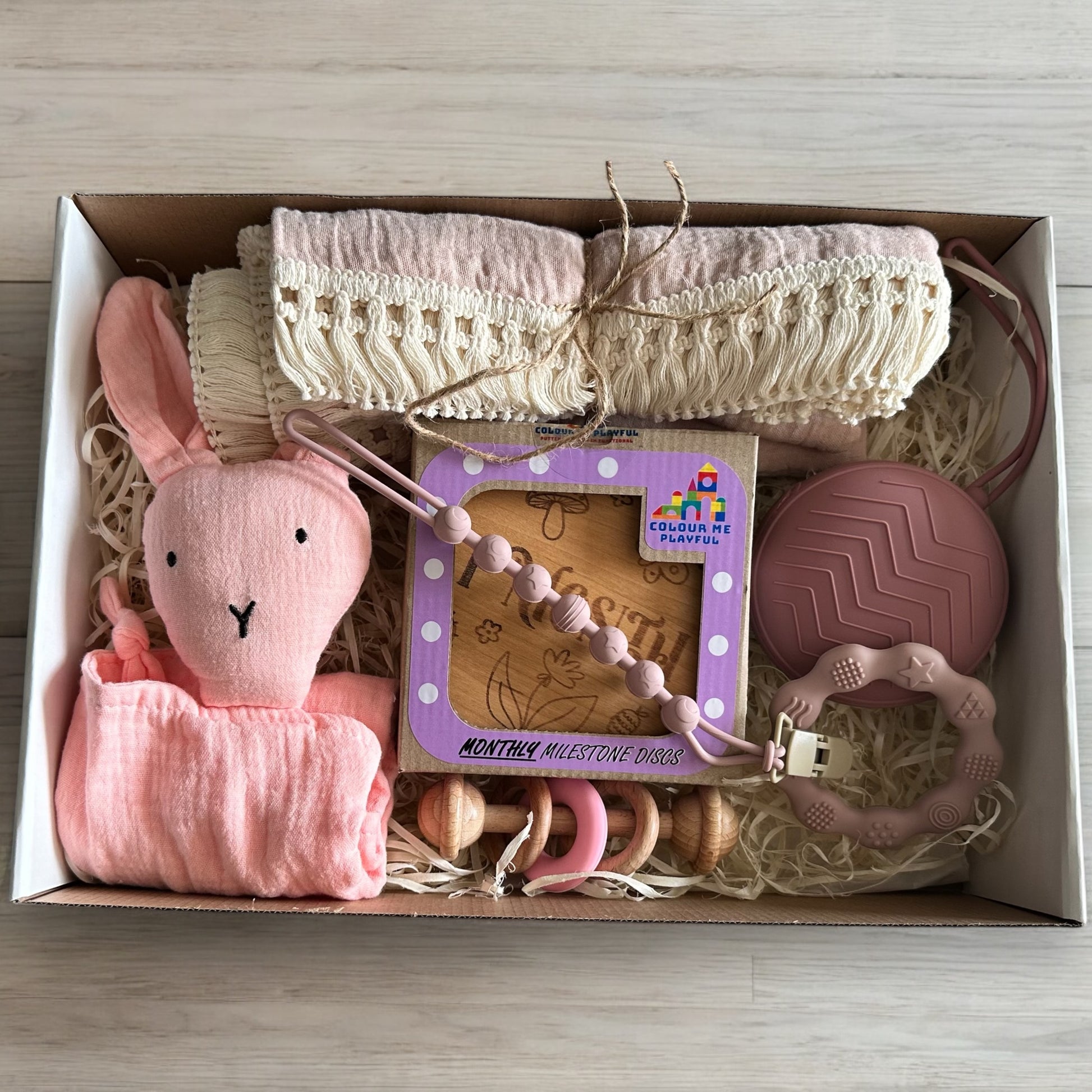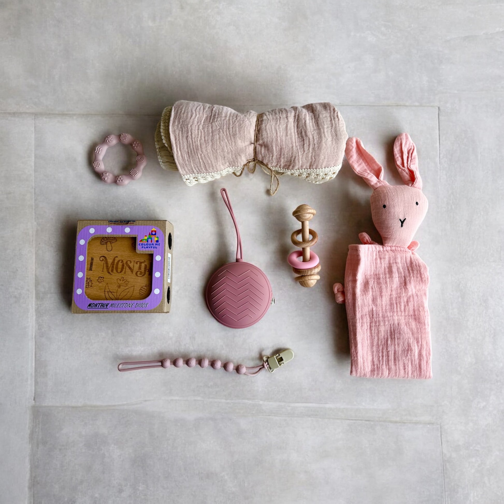 • Pink Tassel Muslin Blanket – Gentle on baby’s skin, providing comfort for nap time, cuddles, and more.