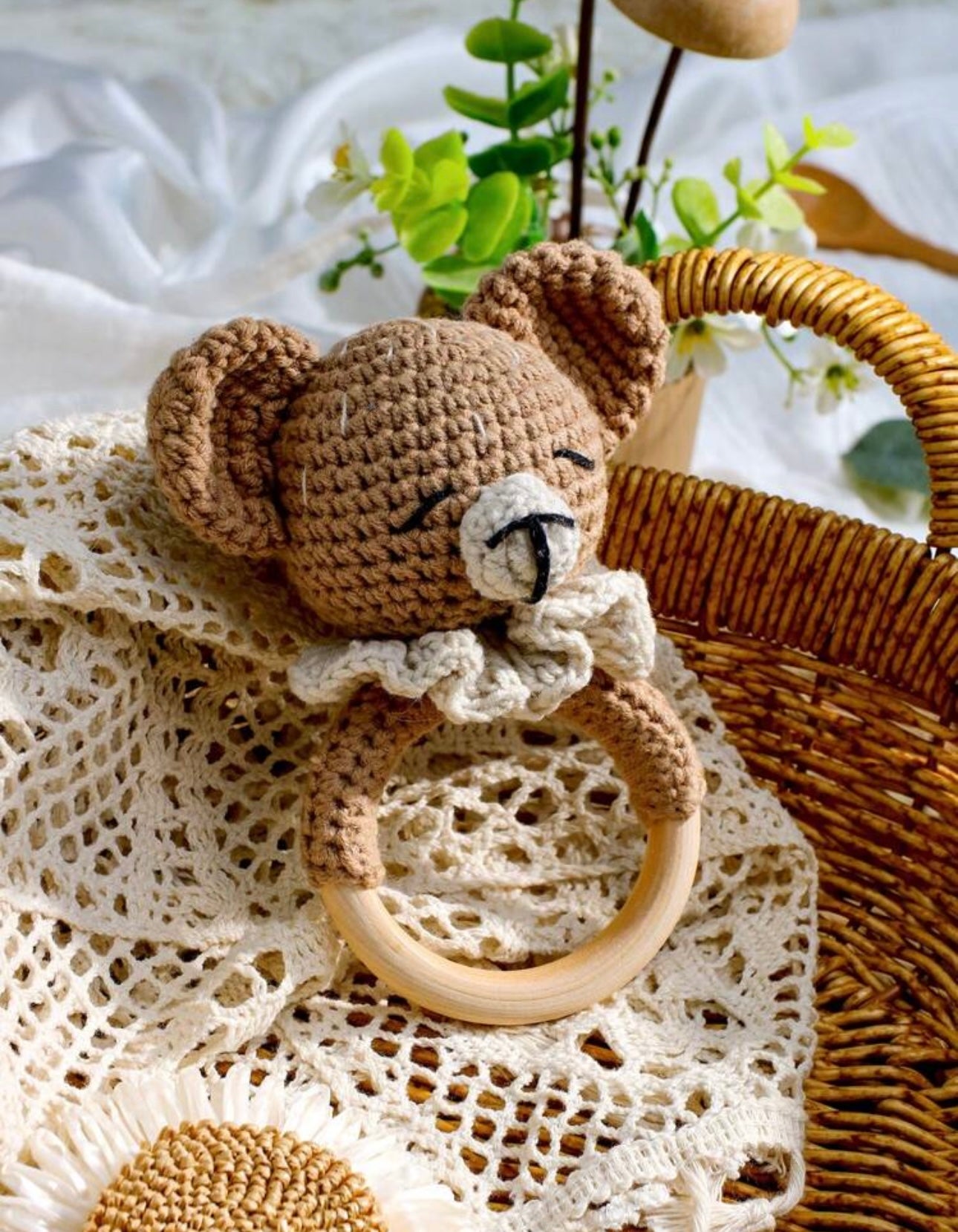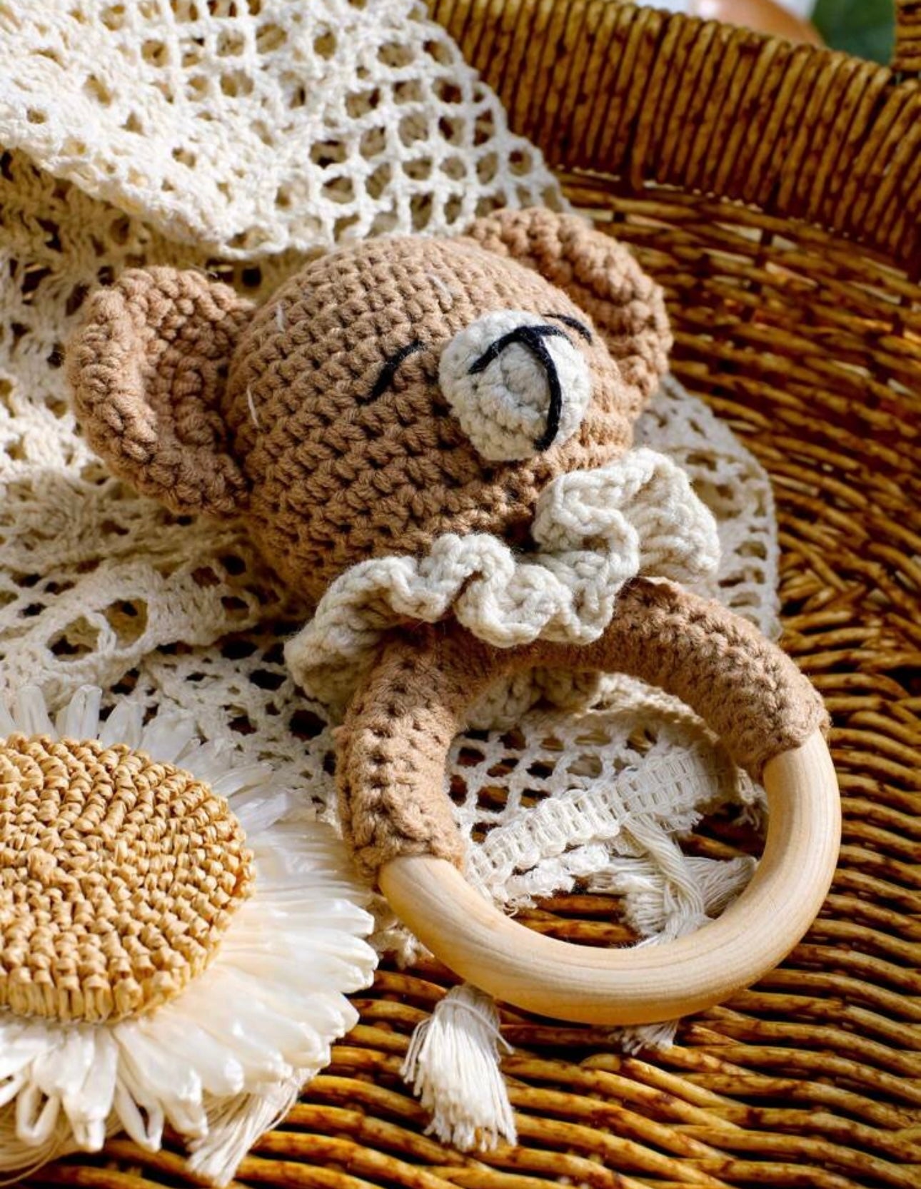 Introduce your baby to sensory play with our Wooden Crochet bear Ring Rattle. This charming rattle features a soft, hand-crocheted bear attached to a smooth, natural wooden ring that’s easy for tiny hands to hold. The gentle rattle sound and various textures stimulate your baby’s developing senses, while the lightweight, durable design makes it perfect for playtime at home or on the go. Made with baby-safe materials, this rattle is designed to soothe, entertain, and engage, encouraging early motor skills and bringing joy to little ones and parents alike.