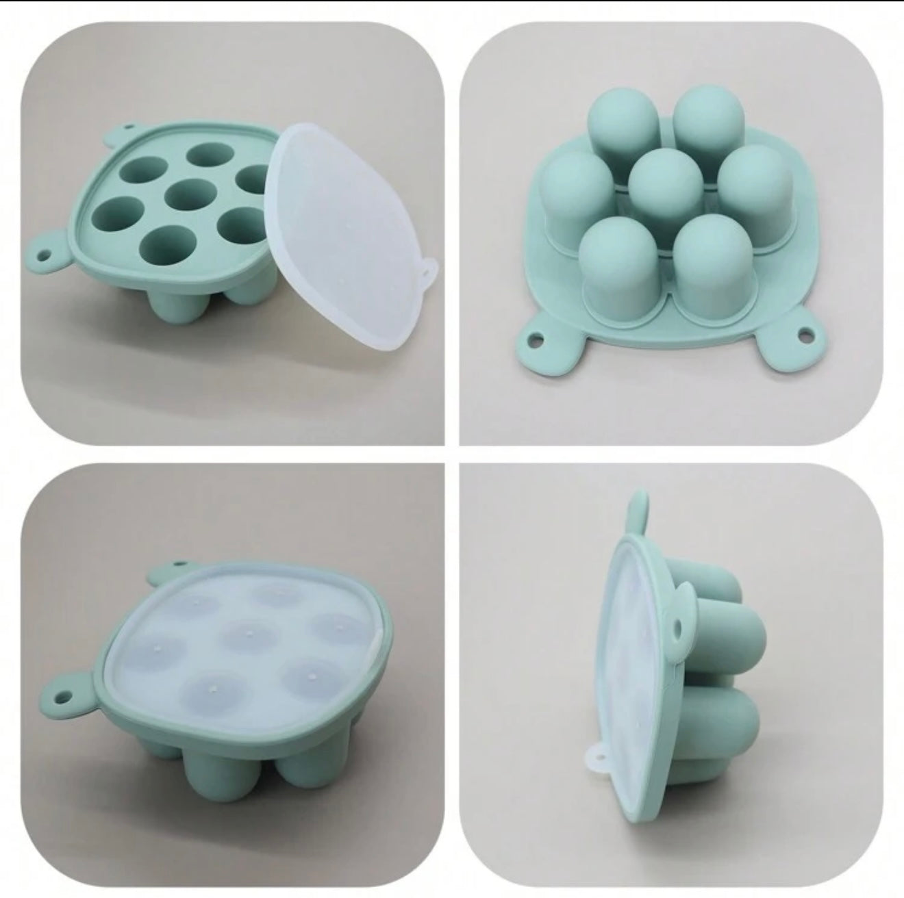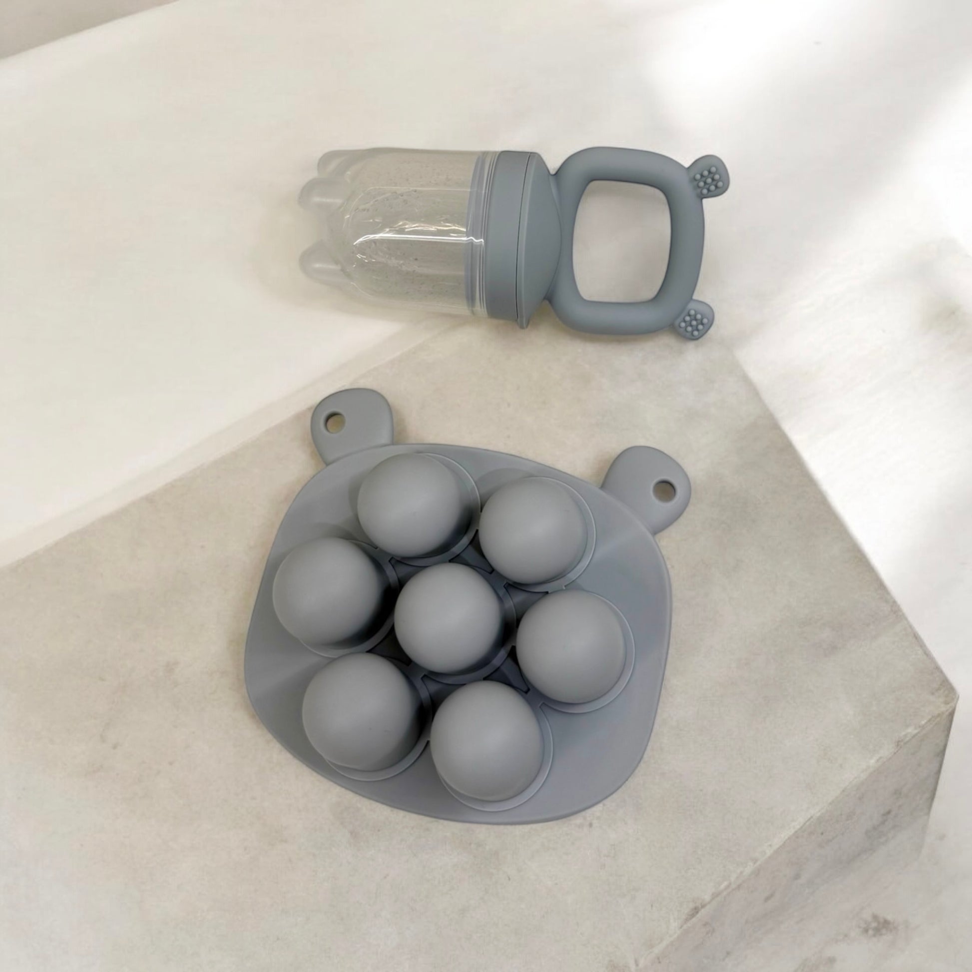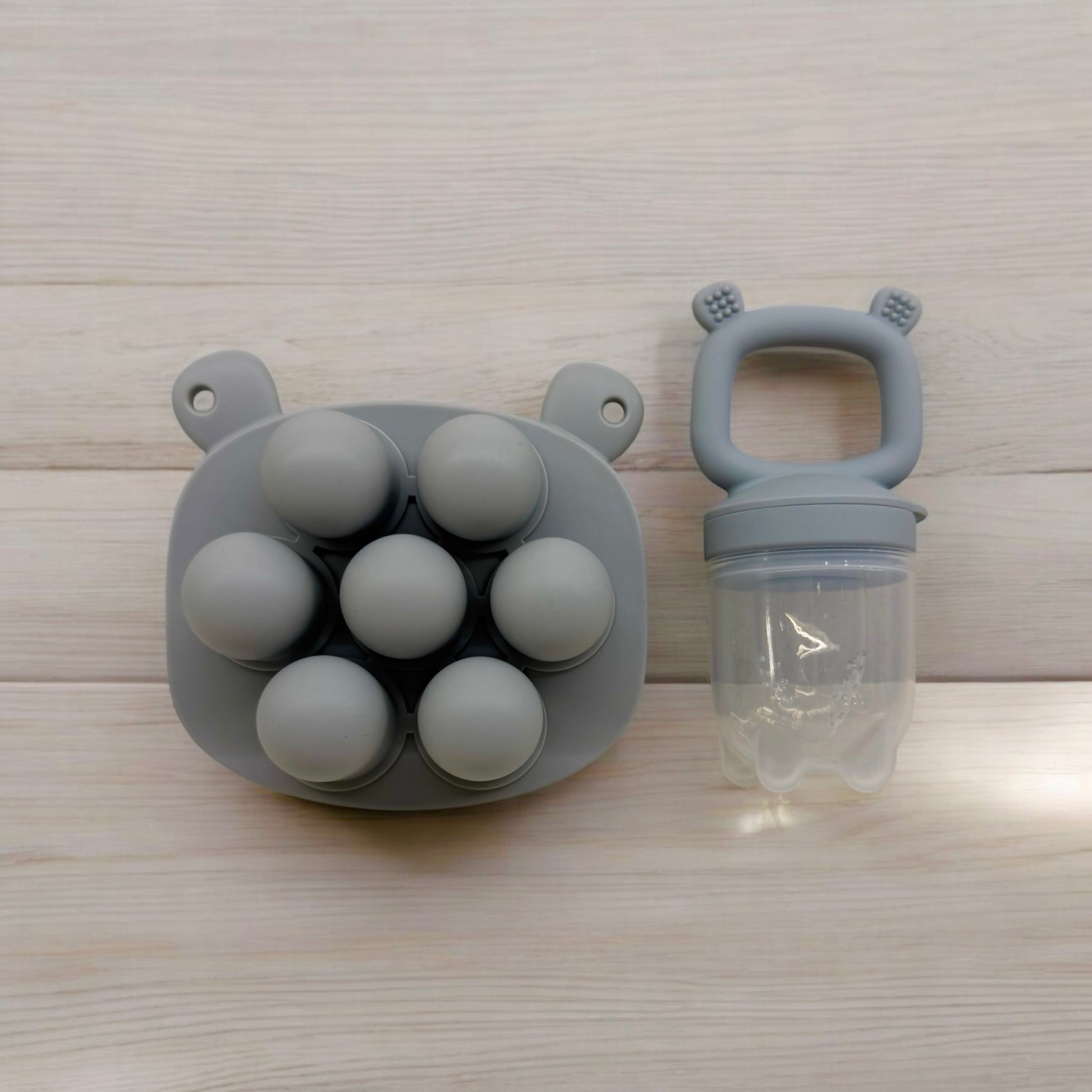 This essential baby feeding set includes a silicone freezer tray with a lid and a silicone pacifier fruit feeder, designed to make introducing solids easy and mess-free. The freezer tray allows you to prep and store homemade purees, breast milk, or small snacks in perfectly portioned silicone compartments. The airtight lid keeps food fresh and prevents spills.